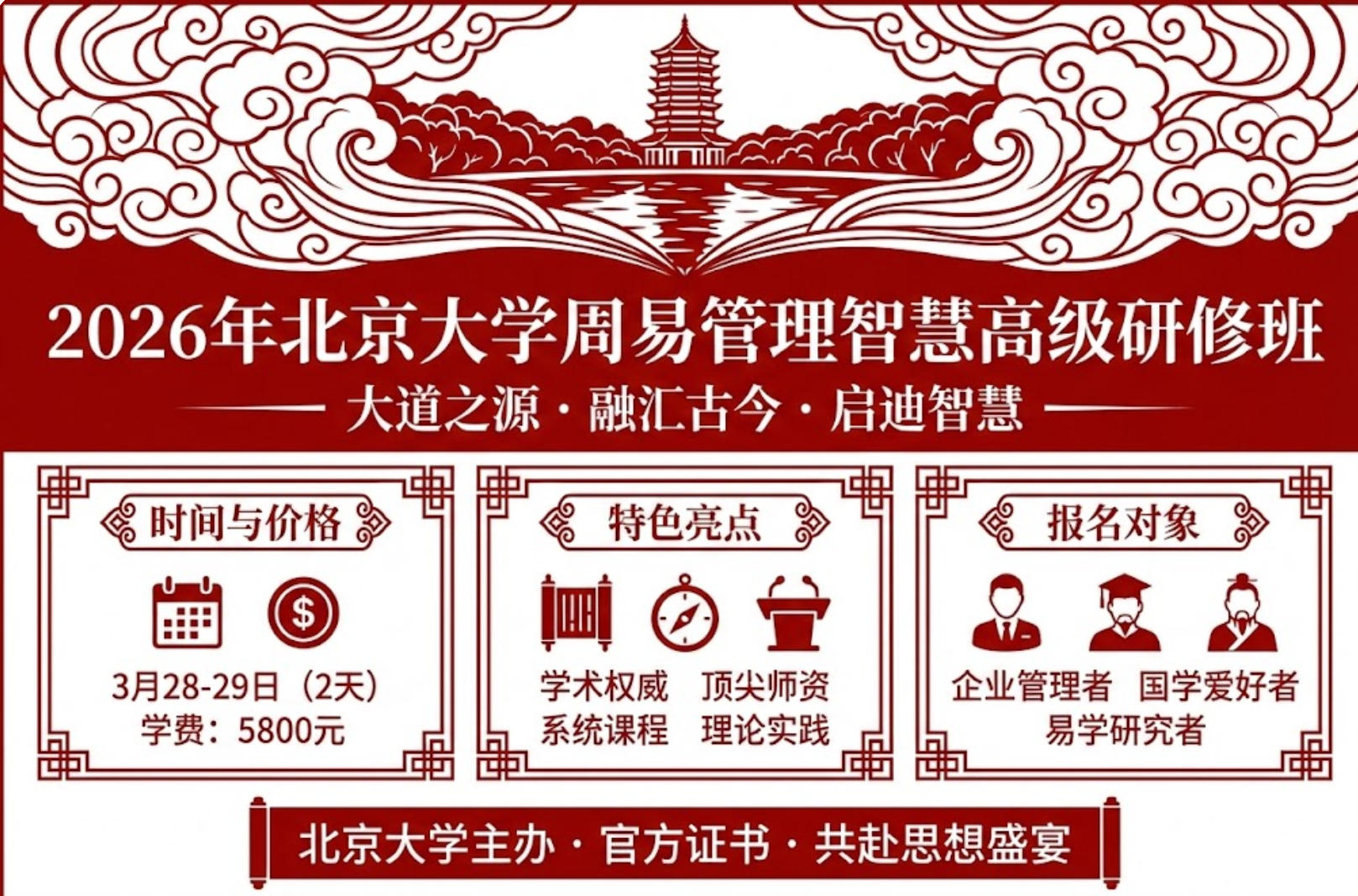 2026 年北京大学周易管理智慧高级研修班是为企业管理者、国学爱好者和传统文化传承者量身打造的高端学术课程。作为中国最高学府的精品研修项目,该课程将古老的易经智慧与现代管理实践完美结合,为学员提供一次深入探索中华文明源头活水的宝贵机会。